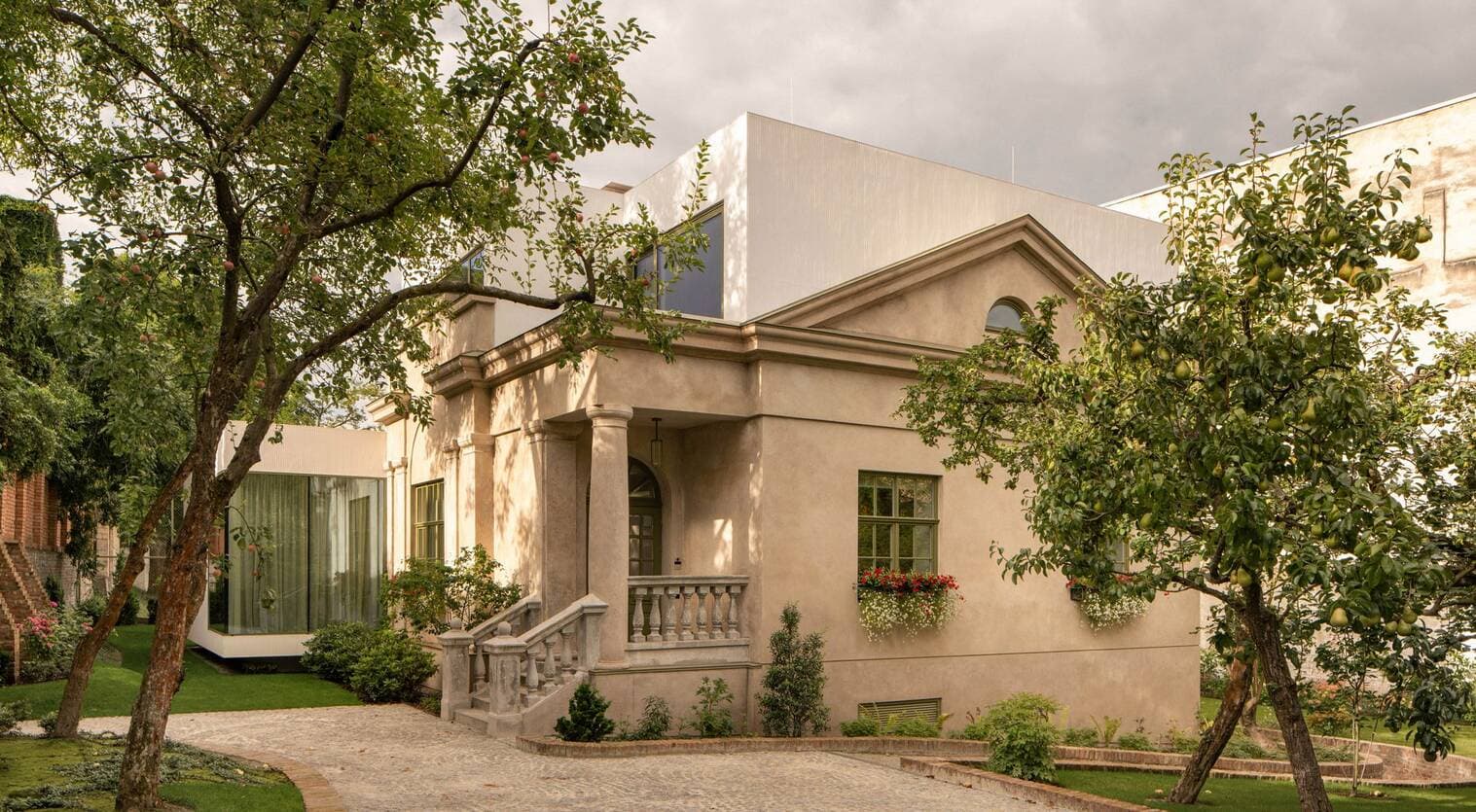 Команда Replus Bureau обрала принципово інший підхід, ніж традиційна реставрація. Архітектори відмовилися від буквального відтворення історичних форм і натомість запропонували поєднати автентичну архітектуру з сучасними елементами. До основного об’єму будівлі додали нові блоки, які свідомо контрастують із неокласичним фасадом. Одним із ключових рішень стала надбудова додаткового поверху у мінімалістичному стилі.